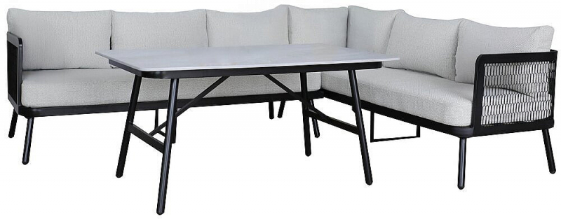 Luxusná rohová hliníková súprava v čiernom prevedení, doplnená o stolovú dosku z hliníka a živice v dezéne kameňa. Moderná súprava, ktorá skvele zapadne do každého exteriéru alebo interiéru.