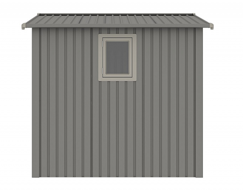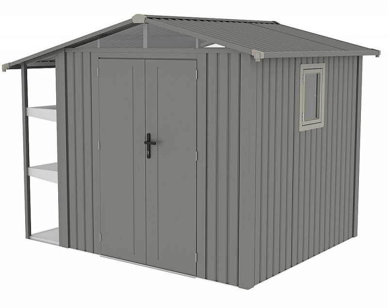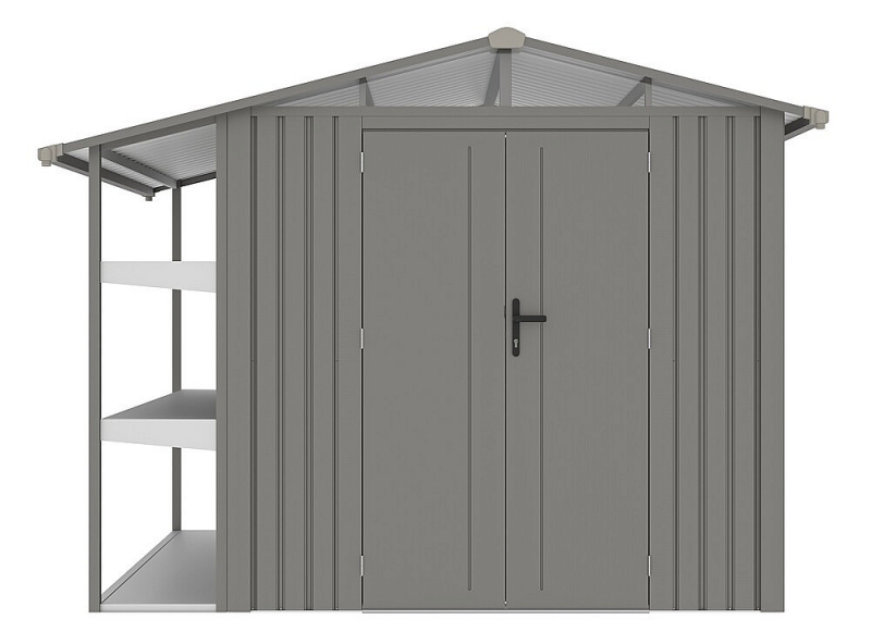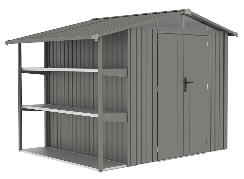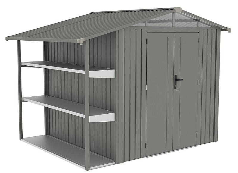 Záhradný domček AMY XB s vonkajšími regálmi.