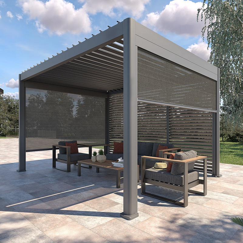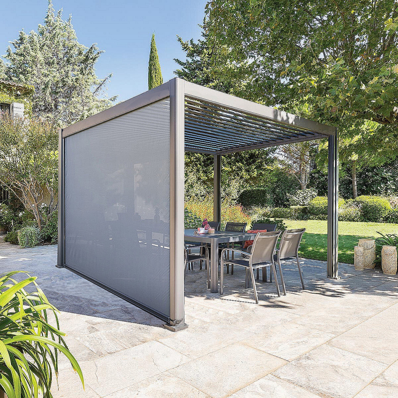 Pergola je vybavená lamelovou strechou, ktorú je možné otáčať kľukou a prepúšťať alebo filtrovať svetlo. Ideálne riešenie pre tých, ktorí chcú veľký priestor na vonkajšie posedenie.