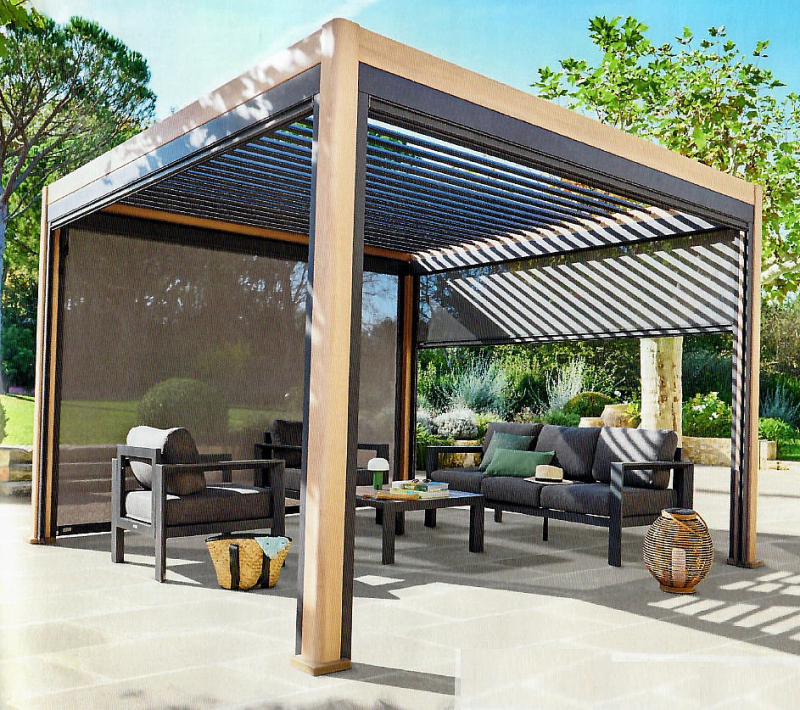 Hliníková pergola v efekte dreva zútulní každú záhradu.