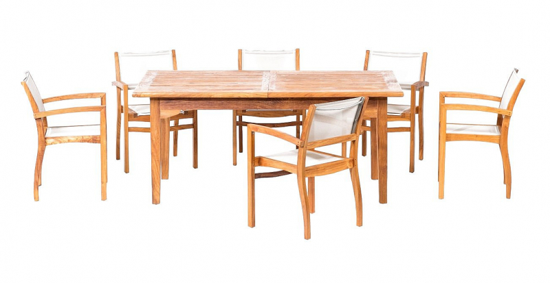 Sestava obsahuje: 1x Teakový stôl ELEGANTE, 6x Teakové kreslo ROMA