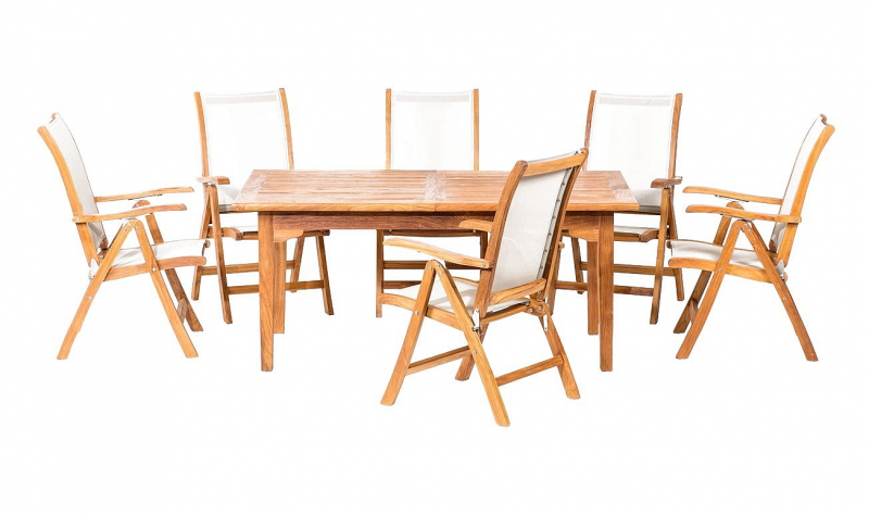 Sestava obsahuje: 1x Teakový stôl ELEGANTE, 6x Skladacie teakové kreslo DIVA