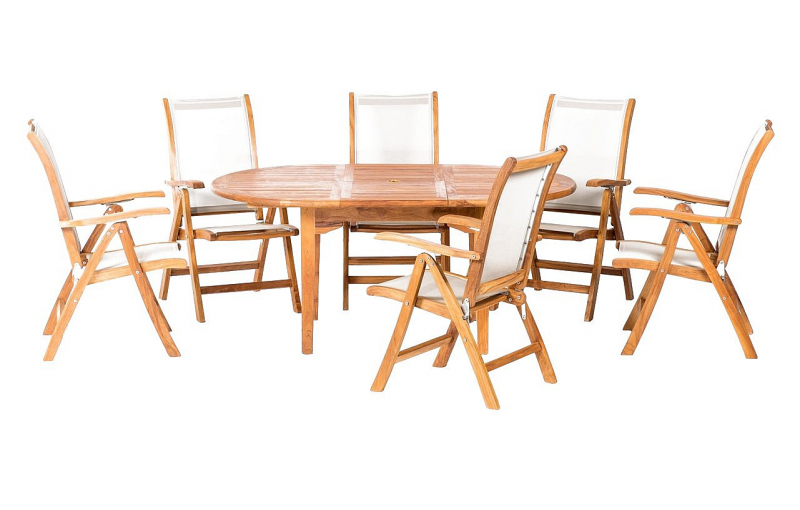 Sestava obsahuje: 1x Teakový stôl ELEGANTE, 6x Skladacie teakové kreslo DIVA