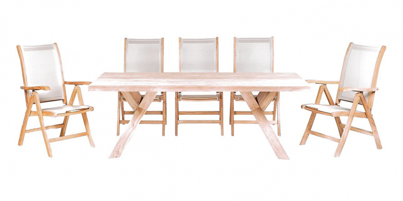 Sestava obsahuje: 1x Teakový stôl SPIDER RECYCLE, 6x Skladacie teakové kreslo DIVA