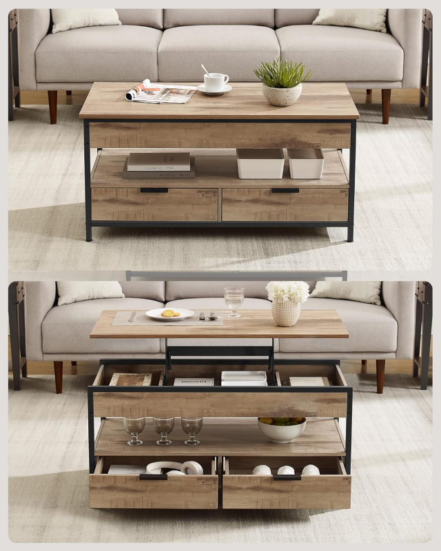 Konštrukcia zdvíhacieho podnosu umožňuje jednoducho nastaviť výšku podnosu od 48 cm do 63 cm a dosiahnuť tak ideálnu polohu na prácu, jedenie alebo hranie, keď pohodlne ležíte na pohovke. Zvýšte svoje pohodlie s týmto konferenčným stolíkom.