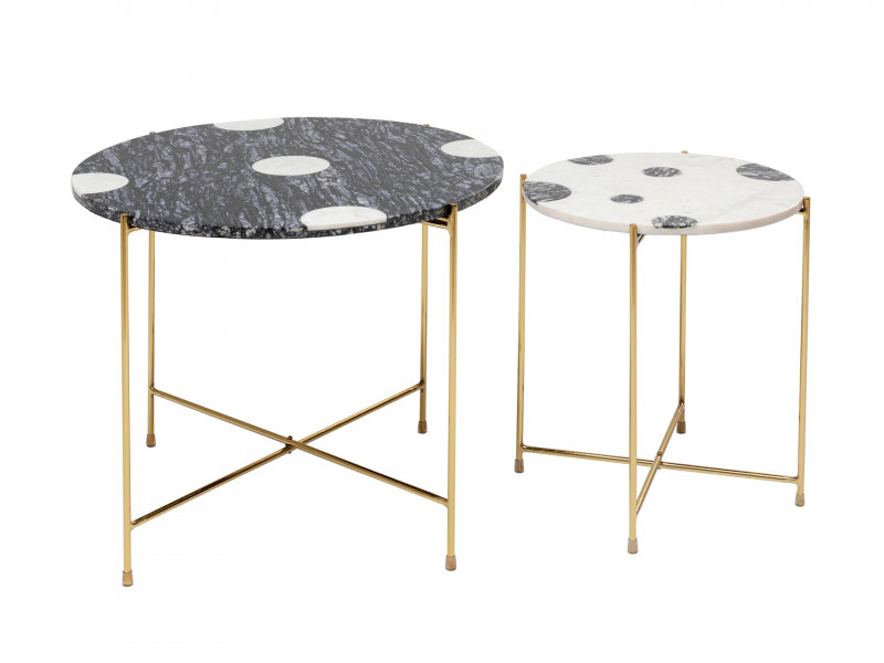 Ručne vyrábané bodky v čiernej a bielej farbe zdobia dosky okrúhlych stolíkov v mramorovom vzhľade, ktoré sa vzájomne dopĺňajú ako duo ale rovnako krásne vyniknú aj ako sólisti. Tieto moderné príručné stolíky sa dodávajú v dvoch veľkostiach: jeden s rozmermi 50x50x50cm a druhý 40x40x45cm. Zvyčajne sú to malé veci, ktoré robia domov skutočným domovom. Príručné stolíky v tom zohrávajú veľkú úlohu, pretože sa dajú využiť mnohými spôsobmi a zútulnia každú izbu. Príručné stolíky sú ideálne napríklad do obývačky ku kreslu, aby ste mali všetko pri čítaní vždy po ruke, alebo ako nočný stolík do spálne.Kare DesignNemecká značka Kare Design symbolizuje kreativitu a jedinečnosť. Už od roku 1981 obohacuje trh netradičnými kúskami, ktorým nechýba poriadna dávka štýlu a fantázie. V ich produktovom portfóliu nájdete širokú škálu nábytku, osvetlenia a bytových doplnkov. Značku Kare Design nájdete vo viac ako 200 obchodoch po celom svete. Dajte priestor svojej predstavivosti a naplňte svoj domov originálnym zariadením od Kare, ktoré si okamžite zamilujete.Väčší stolík Výška50 cmPriemer50 cm Menší stolík Výška 45 cmPriemer40 cm Hmotnosť22,9 kg