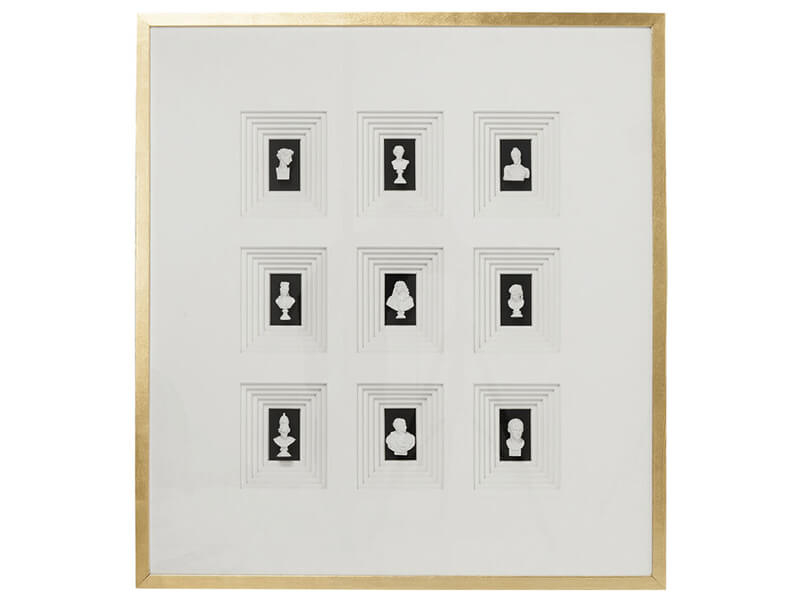 Galéria mini sadrových búst za sklom s hĺbkovým 3D efektom. Zlatý rám z borovicového masívu zvýrazňuje čiernobielu kompozíciu bielych búst na čiernom pozadí. Spojenie klasického umenia s modernými prvkami umožňuje dekorácii vyniknúť v akomkoľvek interiéri. Vďaka XL formátu vynikne aj vo väčších miestnostiach a v izbách s vysokými stropmi. Kare DesignNemecká značka Kare Design symbolizuje kreativitu a jedinečnosť. Už od roku 1981 obohacuje trh netradičnými kúskami, ktorým nechýba poriadna dávka štýlu a fantázie. V ich produktovom portfóliu nájdete širokú škálu nábytku, osvetlenia a bytových doplnkov. Značku Kare Design nájdete vo viac ako 200 obchodoch po celom svete. Dajte priestor svojej predstavivosti a naplňte svoj domov originálnym zariadením od Kare, ktoré si okamžite zamilujete. Výška 110 cm Šírka 100 cm Hĺbka 8 cm Hmotnosť 18 kg