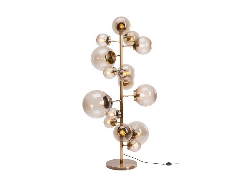 Jedinečná stojaca lampa v elegantnom dizajne rozžiari váš domov a zároveň v interiéri bude pôsobiť ako umelecký objekt. Okolo oceľovej základne s lesklou pomosadzovanou povrchovou úpravou je usporiadaných 15 sklenených gúľ rôznych veľkostí. Má 3 tienidlá s priemerom 30 cm, 5 tienidiel s priemerom 15 cm a 7 tienidiel s priemerom 20 cm. Tienidlá sú pripevnené na nastaviteľných kĺbových ramenách, ktoré umožňujú opätovné usporiadanie lampy podľa potreby. Trblietavé prvky v bublinkovom vzhľade dekorujú svietidlo a zároveň z neho robia štýlový kúsok, ktorý krásne osvetlí priestor vedľa pohovky alebo kresla. Upúta aj v kancelárii či pri vchode do komerčných priestorov. Drôt má dĺžku až 200 cm, vďaka čomu máte dostatočnú flexibilitu pri jej umiestňovaní. Lampa je vybavená flip-spínačom na drôte, čo umožňuje jednoduché zapínanie a vypínanie. Je vhodná pre žiarovku s objímkou E14, ktorá však nie je súčasťou balenia. Disponuje výkonom 4 watty a frekvenciou 50 - 60 Hz. Výška 160 cm Šírka 95 cm Hĺbka 75 cmNapätie230 VHmotnosť15,85 kg