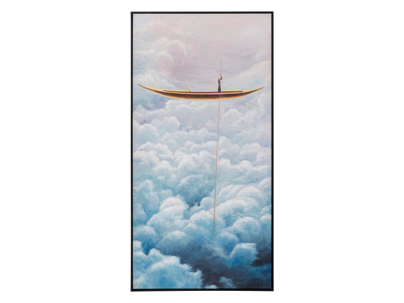 Obraz Cloud Boat vás vytrhne z každodennej reality a premiestni vás do sveta snov a fantázie. Zobrazuje malú loďku, ktorá sa vznáša medzi oblakmi, prinášajúc do vašich priestorov vôňu dobrodružstva a slobody. Je vytvorený s použitím akrylovej farby na bavlnenom plátne, čo zabezpečuje živé farby a hlboké detaily. Jeho rám je zhotovený z masívneho smrekového dreva, ktoré zvýrazňuje prírodný a autentický charakter tohto umeleckého kúsku. Vertikálne upevnenie pomocou háčikov umožňuje ľahkú inštaláciu na vašu stenu. Každý kus je originálom, pretože čiastočne ručná práca zabezpečuje, že každý detail je spracovaný s tou najväčšou starostlivosťou a pozornosťou. Kare DesignNemecká značka Kare Design symbolizuje kreativitu a jedinečnosť. Už od roku 1981 obohacuje trh netradičnými kúskami, ktorým nechýba poriadna dávka štýlu a fantázie. V ich produktovom portfóliu nájdete širokú škálu nábytku, osvetlenia a bytových doplnkov. Značku Kare Design nájdete vo viac ako 200 obchodoch po celom svete. Dajte priestor svojej predstavivosti a naplňte svoj domov originálnym zariadením od Kare, ktoré si okamžite zamilujete. Výška 120 cm Šírka 60 cm Hĺbka 3,5 cm Hmotnosť 2,6 kg