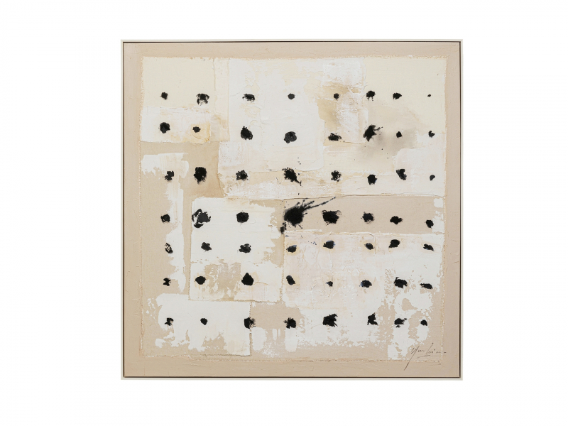 Ručne maľovaný obraz Creative Dots v jemných bledých farbách bude veľmi decentným doplnkom do interiéru. Použité akrylové farby v béžovom odtieni ľahko zladíte s ostatnými doplnkami a zariadením. Bavlnené plátno je spevnené panelom masívneho borovicového dreva, čo dodáva obrazu stabilitu a umožňuje jeho vertikálne, a aj horizontálne upevnenie na stenu. Decentné pastelové farby s tmavými nepravidelnými bodkami dodávajú obrazu originalitu, ktorá podčiarkuje kontrast farieb. Nakoľko je obraz maľovaný ručne, každý jeden je unikátom. Šírka 123 cm Výška 123 cm Hĺbka 5 cm Váha 9 kg