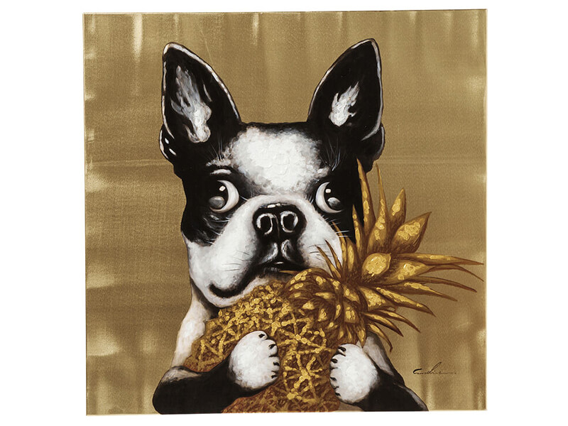 Portrét roztomilého čiernobieleho psíka na zlatom pozadí s ananásom v labkách prinesie dobrú naládu a úsmev do každého interiéru. Ručná maľba akrylovými farbami na bavlnenom plátne je vsadená do rámu z jedľového dreva. Obraz je ideálnou voľbou najmä do moderných interiérov, ktorým dodá hravosť a útulnú atmosféru.Kare DesignNemecká značka Kare Design symbolizuje kreativitu a jedinečnosť. Už od roku 1981 obohacuje trh netradičnými kúskami, ktorým nechýba poriadna dávka štýlu a fantázie. V ich produktovom portfóliu nájdete širokú škálu nábytku, osvetlenia a bytových doplnkov. Značku Kare Design nájdete vo viac ako 200 obchodoch po celom svete. Dajte priestor svojej predstavivosti a naplňte svoj domov originálnym zariadením od Kare, ktoré si okamžite zamilujete. Výška 80 cm Šírka 80 cm Hĺbka 3,5 cm Hmotnosť 1,4 kg