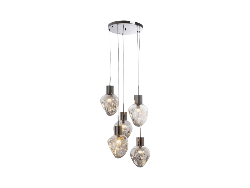 Táto elegantná závesná lampa dodá vášmu domovu jedinečný šmrnc a so štýlom rozžiari každú miestnosť. Je vyhotovená z kvalitnej pochrómovanej ocele má päť tienidiel zaujímavého tvaru. Tienidlá disponujú rozmermi 25 x 25 x 25 cm a sú vyrobené z galvanizovaného skla. Baldachýn má veľkosť 3,50 x 45 x 45 cm a drôty majú nastaviteľnú dĺžku od 50 – 160 cm, takže si lampu môžete jednoducho prispôsobiť podľa vašich preferencií. Lampa je vhodná pre žiarovky s objímkou E27, ktorá však nie je súčasťou balenia. Disponuje výkonom 40 wattov a frekvenciou 50 - 60 Hz. Výška 160 cm Šírka 50 cm Hĺbka 50 cm Hmotnosť 14,85 kgNapätie230 V