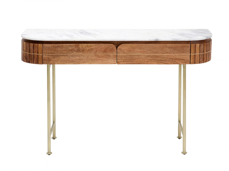 Ručne vyrobený konzolový stolík Grace z masívneho mangového dreva a mramoru vyniká nie len vysokou kvalitou, ale aj elegantným vzhľadom. Výborne poslúži na odloženie potrebných drobností. Vďaka jednoduchým líniam skvele zapadne do každej domácnosti. Nohy konzolového stolíka sú z ocele s práškovým nástrekom a celková nosnosť stolíka je 20 kg. Kare DesignNemecká značka Kare Design symbolizuje kreativitu a jedinečnosť. Už od roku 1981 obohacuje trh netradičnými kúskami, ktorým nechýba poriadna dávka štýlu a fantázie. V ich produktovom portfóliu nájdete širokú škálu nábytku, osvetlenia a bytových doplnkov. Značku Kare Design nájdete vo viac ako 200 obchodoch po celom svete. Dajte priestor svojej predstavivosti a naplňte svoj domov originálnym zariadením od Kare, ktoré si okamžite zamilujete. Výška 76 cm Šírka 100 cm Hĺbka 30 cm Hmotnosť 28 kg