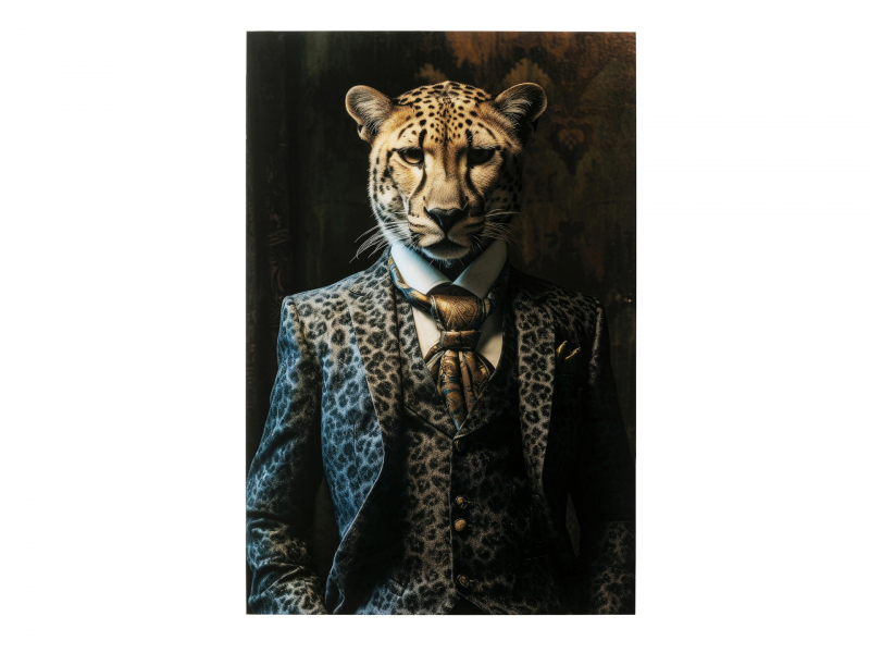 Extravagantný obraz Mister Leo je prepojením tlmených farieb a originality, ktoré sú zachytené znázornením dominantného leoparda. Tmavý podklad podčiarkuje samotného leoparda oblečeného do obleku s leopardím vzorom. Obraz je zhotovený z bezpečnostného laminovaného skla, vďaka ktorému obraz dostáva ešte lepší dizajn, ktorý podčiarkuje práve lesklý vzhľad. Tento obraz bude dokonalým darčekom pre fanúšikov extravagancie. Sklo má hrúbku 4 mm a obraz sa upevňuje na stenu vertikálne. Šírka100 cm Výška 150 cm Hĺbka 0,4 cm Váha 15 kg