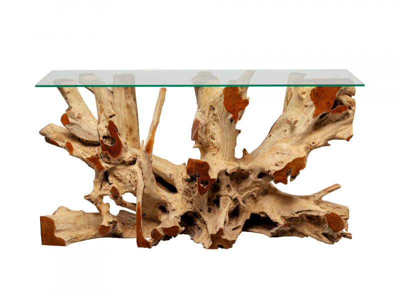 Atraktívny konzolový stolík, ktorý spája modernú eleganciu s prírodným šarmom. Podstavec z koreňa masívneho teakového dreva nesie platňu z 10 cm hrubého, číreho bezpečnostného skla. Široký obdĺžnikový stolík je vhodný do priestranných interiérov, v ktorých vynikne jeho masívna podnož a prirodzený drevený vzhľad. Každý kus je originál.Návod na stiahnutie TU. Kare DesignNemecká značka Kare Design symbolizuje kreativitu a jedinečnosť. Už od roku 1981 obohacuje trh netradičnými kúskami, ktorým nechýba poriadna dávka štýlu a fantázie. V ich produktovom portfóliu nájdete širokú škálu nábytku, osvetlenia a bytových doplnkov. Značku Kare Design nájdete vo viac ako 200 obchodoch po celom svete. Dajte priestor svojej predstavivosti a naplňte svoj domov originálnym zariadením od Kare, ktoré si okamžite zamilujete. Výška 83 cm Šírka 150 cm Hĺbka 45 cm Váha 120 kg
