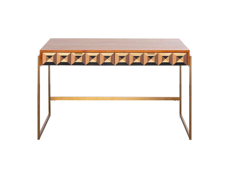 Jedinečný písací stôl Silencio vás zavedie do sveta elegancie a originality. Orechová dyha zdobí rám a prednú stranu písacieho stola, zatiaľ čo rám a rukoväte z brúsenej nehrdzavejúcej ocele v mosadznej farbe mu dodávajú luxusný dotyk. Tento vzor vytvára zaujímavú trojrozmernú ilúziu, vďaka ktorej sa stane stredobodom každej miestnosti. Svojou všestrannosťou poslúži aj ako konzolový stolík v jedálni alebo v priestrannej predsieni. Každý stolík Silencio je jedinečný, čiastočne ručne vyrobený, čo z neho robí nielen funkčný kúsok nábytku, ale aj umenie, ktoré pridá šmrnc do vášho domova. Výška 76 cm Šírka 120 cm Hĺbka 59 cm Nosnosť 100 kg Hmotnosť 38 kg