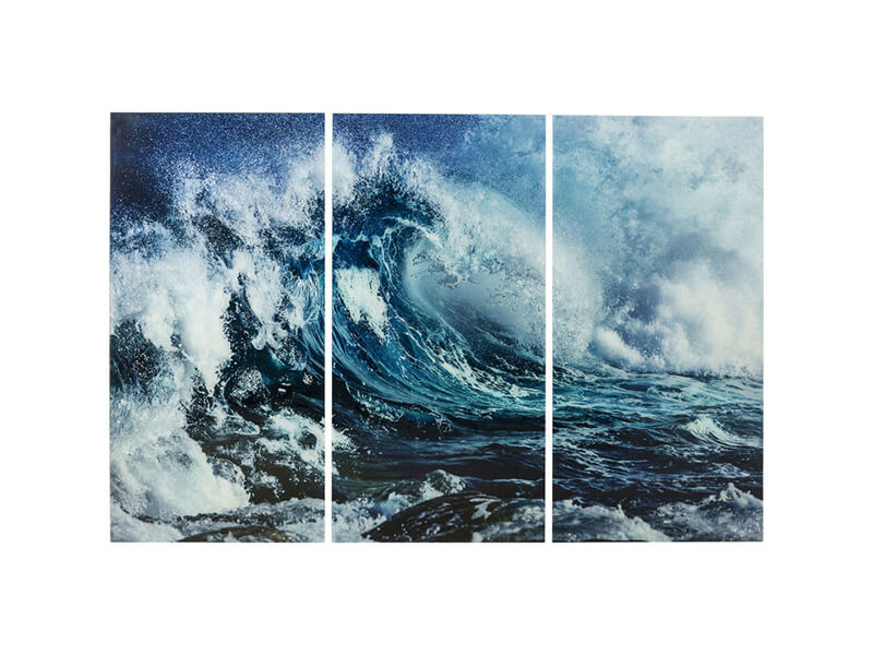 Sklenený obraz pozostávajúci z troch častí, ktoré ako celok dokonale vystihujú silu a nespútanosť mora. Obrovská vlna pôsobí dynamickým, no zároveň upokojujúcim dojmom. Monumentálne dielo vo všetkých odtieňoch modrej skrášli akýkoľvek moderný interiér, do ktorého vnesie vzrušujúcu krásu mora. Obraz je vyhotovený z polypropylénu laminovaného tvrdeným bezpečnostným sklom. Kare DesignNemecká značka Kare Design symbolizuje kreativitu a jedinečnosť. Už od roku 1981 obohacuje trh netradičnými kúskami, ktorým nechýba poriadna dávka štýlu a fantázie. V ich produktovom portfóliu nájdete širokú škálu nábytku, osvetlenia a bytových doplnkov. Značku Kare Design nájdete vo viac ako 200 obchodoch po celom svete. Dajte priestor svojej predstavivosti a naplňte svoj domov originálnym zariadením od Kare, ktoré si okamžite zamilujete. Výška 160 cm Šírka 240 cm Hĺbka 0,5 cm Váha 38,4 kg