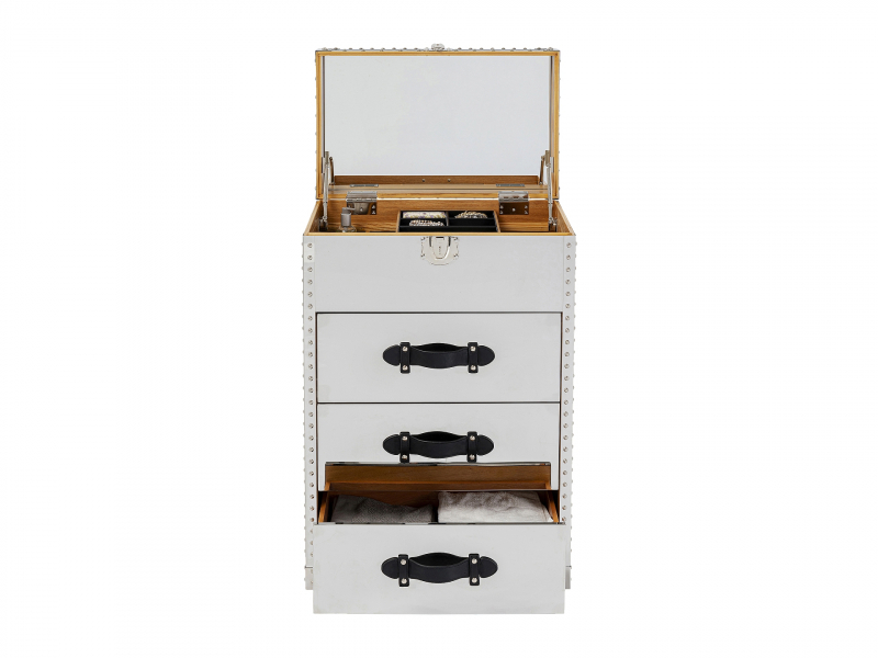 Vegas Make Up zrkadlová komoda prinesie do vášho domova okamžitý pocit luxusu. Tento elegantne navrhnutý kozmetický stolík ponúka mnoho ďalších výhod. Funkčná zrkadlová komoda pomáha udržiavať poriadok a všetky kozmetické potreby mať vždy po ruke. Denné líčenie sa tak stane príjemným rituálom. Táto kompaktná komoda lakovaným nerezovým povrchom má rozmery 100 x 65 x 40 centimetrov (výška/šírka/hĺbka). Zrkadlový stolík má výklopnú vrchnú časť, čo z neho robí ideálne miesto pre vašu každodennú starostlivosť. Tri priestranné zásuvky ponúkajú dostatok úložného priestoru pre vaše kozmetické výrobky, šperky a ďalšie drobnosti. Pod zrkadlom sa nachádzajú praktické priehradky a rozdelenia na drobnosti, ktoré vám pomôžu udržať všetko organizované. Komoda je nenáročná na údržbu a kompaktná, čo z nej robí ideálne riešenie do spálne alebo kúpeľne. Výška 100 cm Šírka 65 cm Hĺbka 40 cm Hmotnosť 59 kg