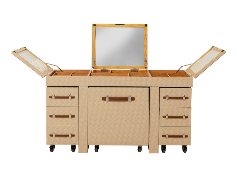Dajte svojmu líčeniu nový rozmer s mobilným toaletným stolíkom Venezia v teplej béžovej farbe. Tento elegantný toaletný stolík obsahuje množstvo funkčných detailov. Je vyrobený z robustnej drevovláknitej dosky a pokrytý elegantným poťahom s prúteným vzhľadom. Ostatné prvky sú vyrobené z jaseňovej dyhy. Je namontovaný na oceľových kolieskach, takže ho môžete ľahko presunúť, kam potrebujete. Tento toaletný stolík má aj vlastnú taburetku s rozmermi 56 x 46 x 57 cm, ktorá sa dá pod neho prakticky zasunúť. K dispozícii sú aj dve mobilné časti so zásuvkami, zrkadlo a početné priehradky v doske stola, ktoré vám poslúžia na uloženie make-upu, kozmetických výrobkov, či iných potrieb. Inšpirujte sa týmto toaletným stolíkom a nalíčte sa ako hviezda!Kare DesignNemecká značka Kare Design symbolizuje kreativitu a jedinečnosť. Už od roku 1981 obohacuje trh netradičnými kúskami, ktorým nechýba poriadna dávka štýlu a fantázie. V ich produktovom portfóliu nájdete širokú škálu nábytku, osvetlenia a bytových doplnkov. Značku Kare Design nájdete vo viac ako 200 obchodoch po celom svete. Dajte priestor svojej predstavivosti a naplňte svoj domov originálnym zariadením od Kare, ktoré si okamžite zamilujete. Výška 78 cm Šírka 138 cm Hĺbka 50,5 cm Hmotnosť 105 kgNosnosť10 kg
