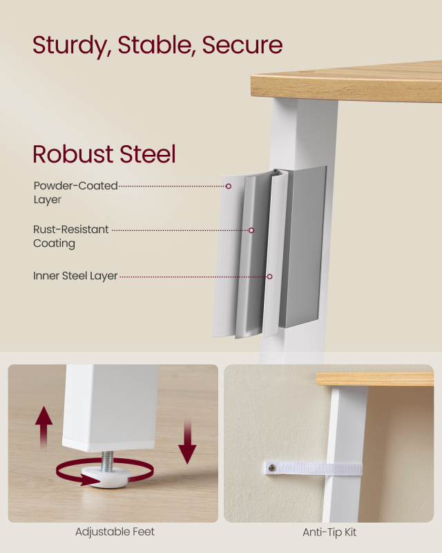 Vďaka trojnohej konštrukcii a nastaviteľnej zadnej nohe je tento rohový regál stabilný na mierne nerovných podlahách a tesne prilieha ku každej stene. Súprava proti prevráteniu tiež poskytuje väčšiu bezpečnosť