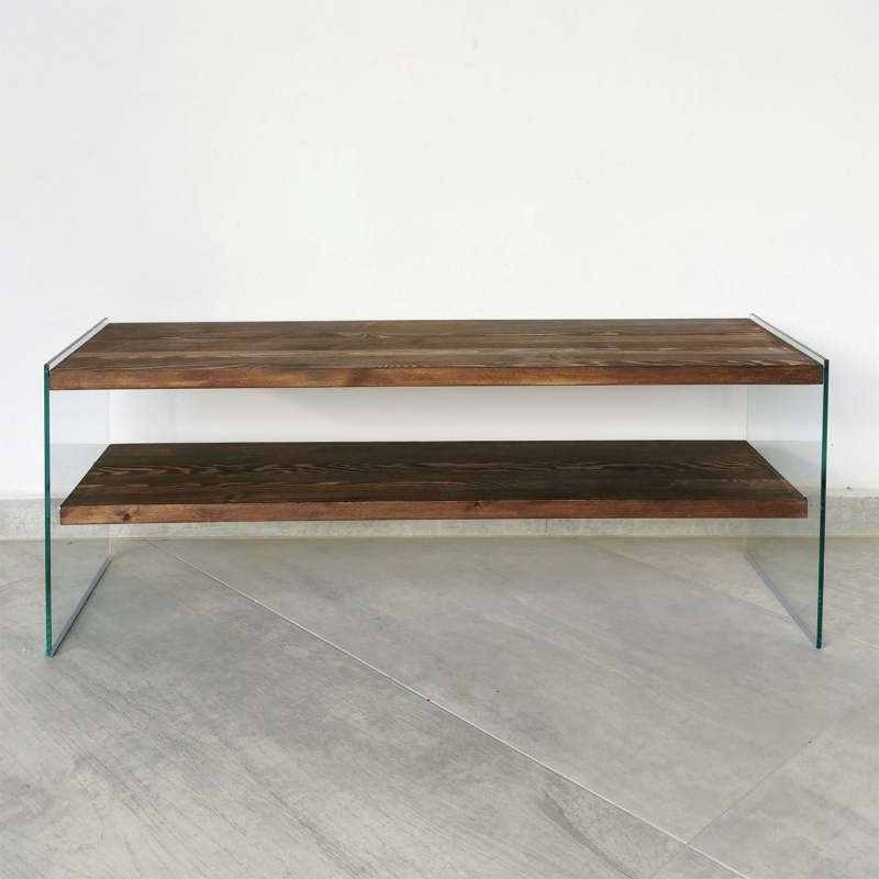Extravagantný SKLENENENÝ konferenčný stolík so sklenenými bočnicami a policou.