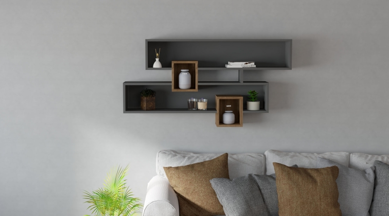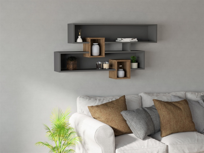 Nástenná polica kombinuje geometrické tvary štvorcov a obdĺžnikov v originálnom dizajne s dôrazom na maximalizáciu priestoru. Vďaka jemným farbám možno poličku zavesiť na stenu v akejkoľvek miestnosti.