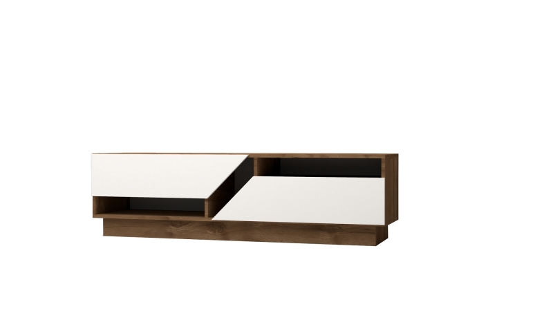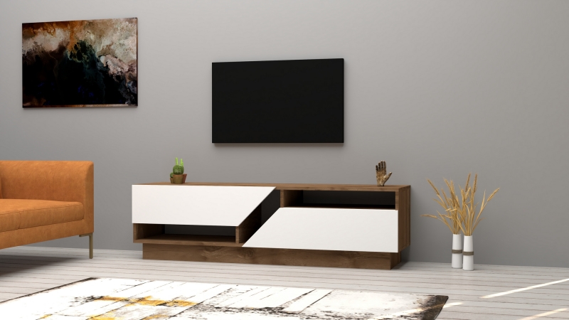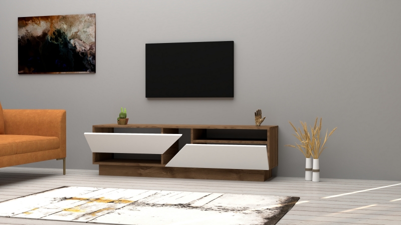 Nadčasovo moderný TV stolík z orechového dreva. Dvere stola sú biele. Stôl má dve skrinky, do ktorých môžete uložiť veľa vecí.