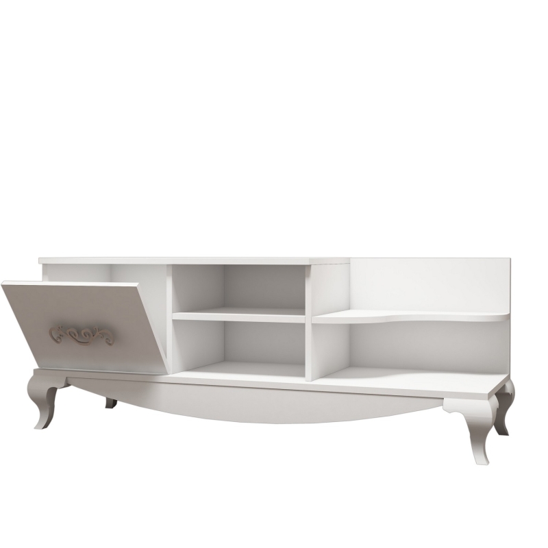 Jednoduchý TV stolík SULTAN v štýle Vintage - kombinácia moderných a retro prvkov, v bielej farbe pôsobí na prvý pohľad veľmi elegantne. Má dostatok priestoru na odkladanie a odkladanie rôznych predmetov, čo spĺňa funkčnosť, a tak sa stáva ideálnym doplnkom menších interiérov vo vidieckom alebo vintage štýle.