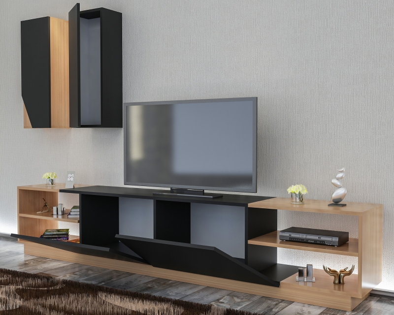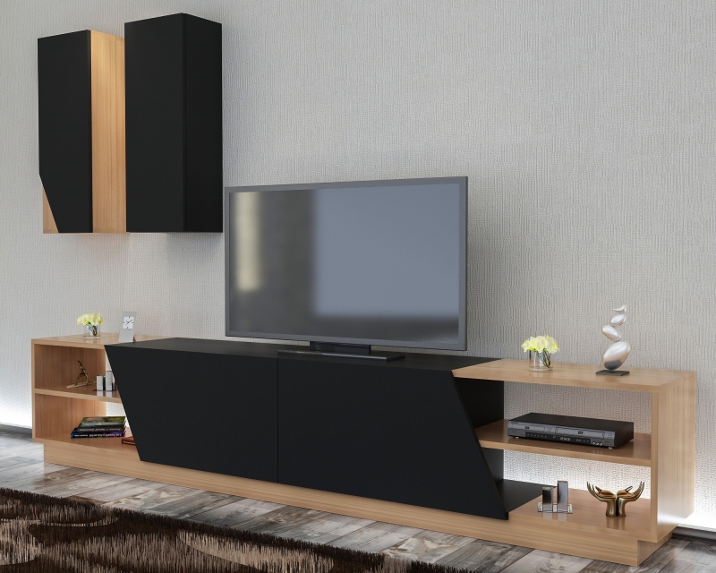 Kombinácia svetlého dreva a čiernej farby vytvára elegantný vzhľad obývacej steny ZEBRA.