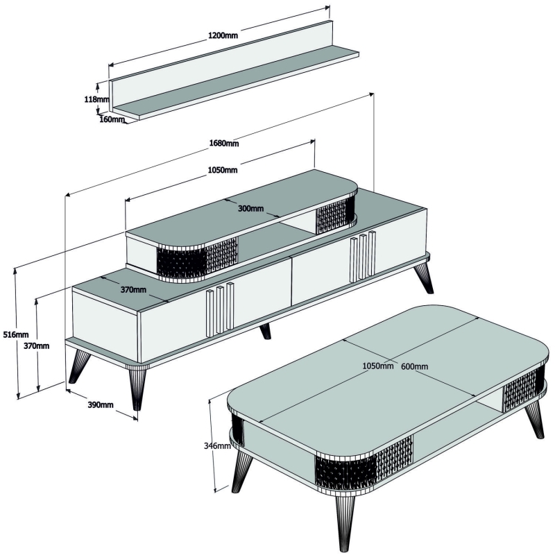 Konferenčný stolík, polica a TV stolík v hnedo-krémovej kombinácii s dekoratívnymi odvážnymi detailmi.