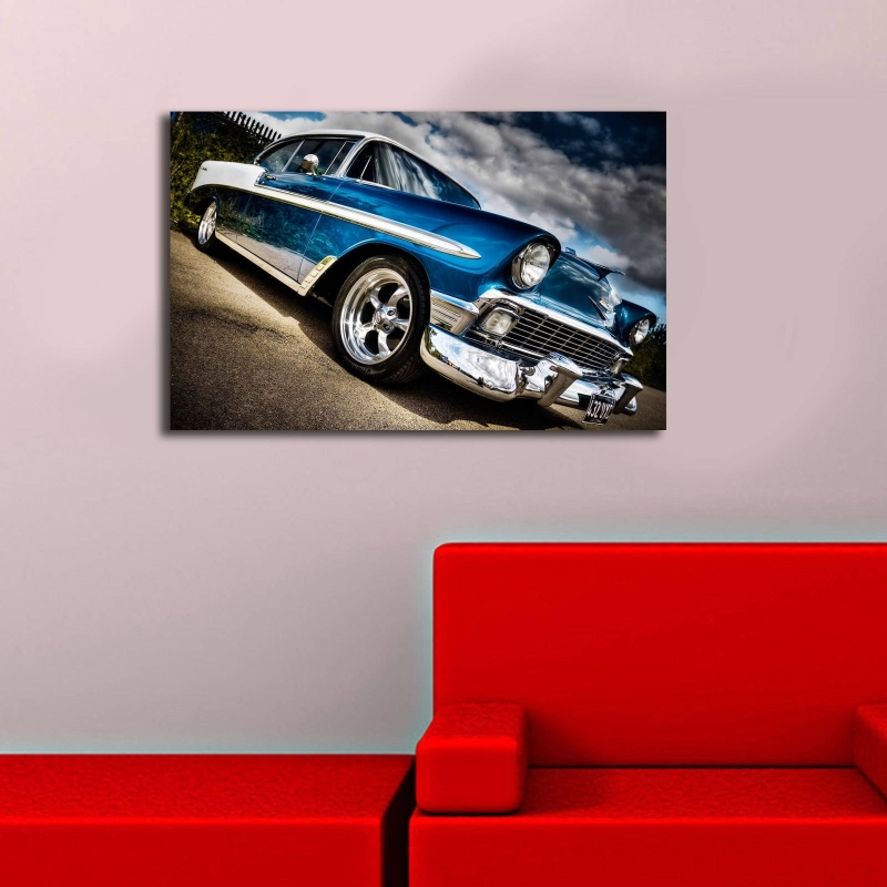 Nástenná maľba na plátne s LED podsvietením zobrazujúca CHEVROLET BEL AIR.