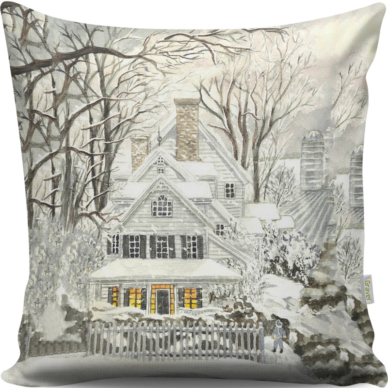 Dekoračný vankúš s motívom ZASNEŽENÁ CHATKA.