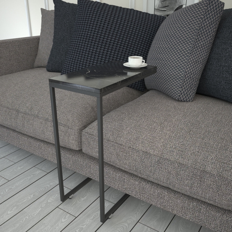 CALLEN je odkladací stolík s kovovou konštrukciou v dekore čierneho mramoru, ktorý oceníte pri sledovaní televízie. Tento stolík môžeme voľne postaviť vedľa sedacej súpravy alebo ho môžeme zasunúť k sedacej súprave a získať tak miesto na raňajky, zemiačiky alebo notebook. Konštrukcia je kovová na kolieskach, materiál sa dobre udržuje a zaručuje dlhú životnosť. Materiál: melamínom potiahnutá drevotrieska Hrúbka: 18 mm Kovové nohy na kolieskach Elektrostaticky práškovo lakované nohy Šírka: 46 cm
