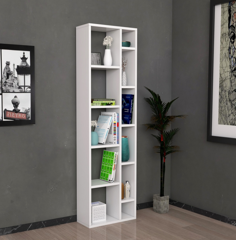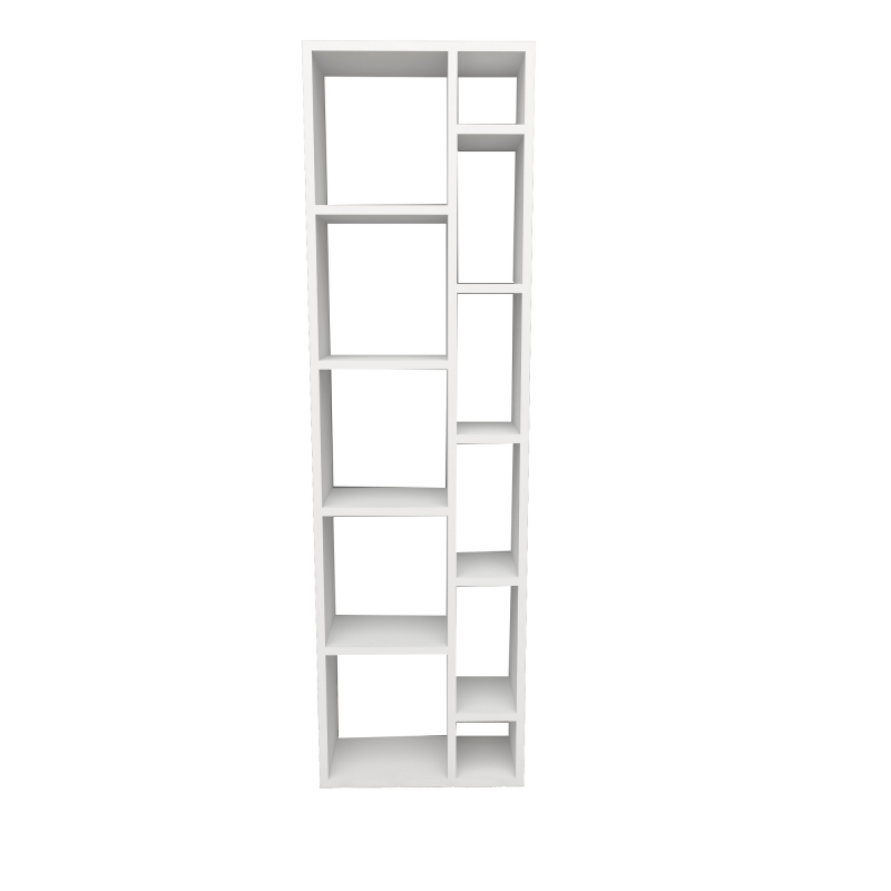 TOMI je veľmi jednoduchý biely regál s dvoma typmi poličiek, širokú a úzku.