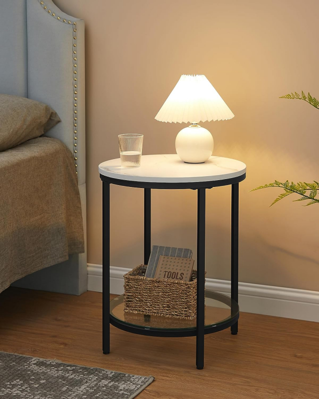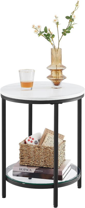 Stolík je vyrobený z čiernej kovovej konštrukcie a dvoch okrúhlych dosiek, z ktorých jedna je zdobená bielym mramorom a druhá čírym tvrdeným sklom.