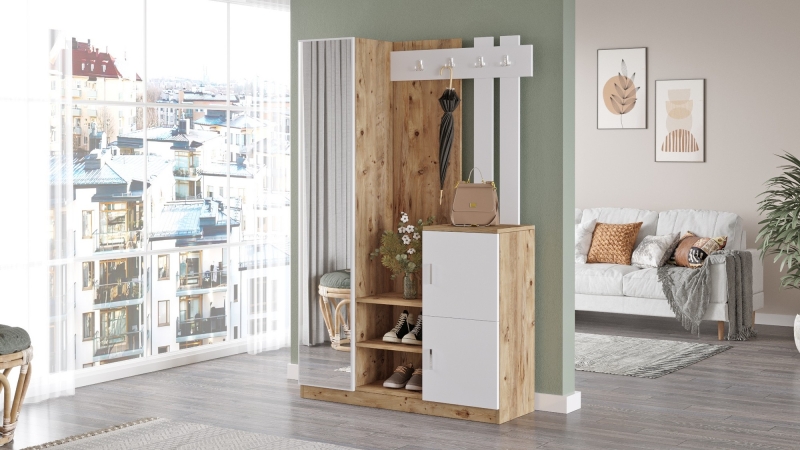 Priestranná predsieňová stena v obľúbenej elegantnej bielej farbe v kombinácii s borovicou atlantickou rozžiari každú predsieň a chodbu.