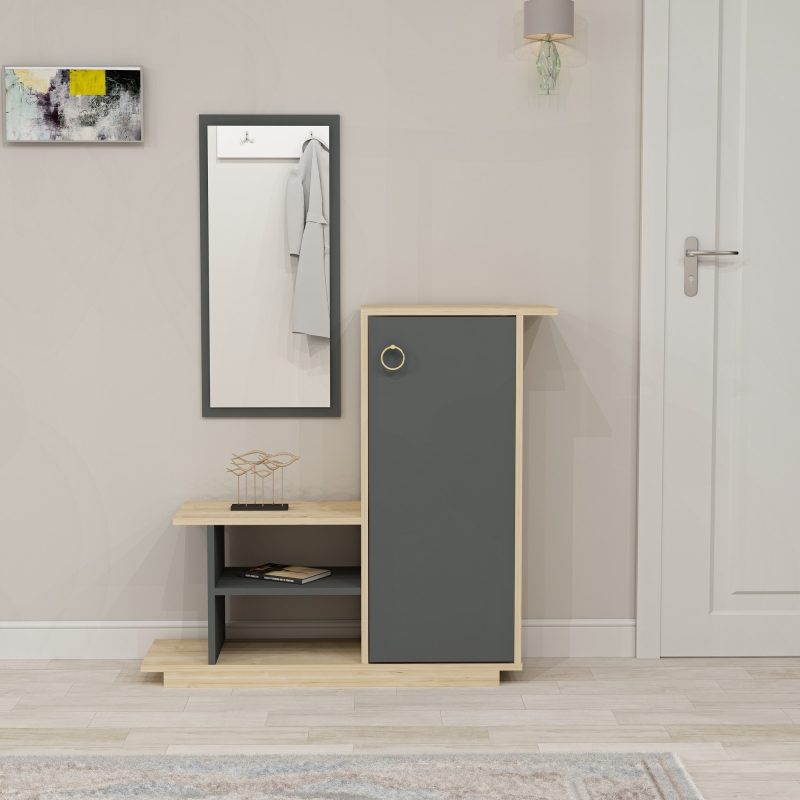 Súčasťou steny je zrkadlo, skrinka na topánky a otvorená skrinka/skrinka na topánky. Elegantná kombinácia antracitového a dubového dekoru sa hodí do každej predsiene.