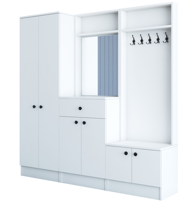 Praktická a elegantná biela predsieňová stena má všetko, čo má správna predsieňová stena mať. Veľké úložné priestory, vešiak na topánky, zrkadlo a množstvo háčikov na zavesenie oblečenia.