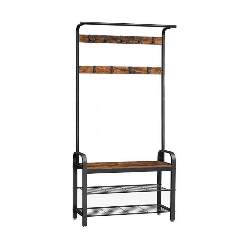 Vešiak na klobúky a kabáty má nielen 9 robustných háčikov a tyč na oblečenie v hornej časti, ale aj dve kovové drôtené police na topánky a stabilnú lavicu na pohodlné sedenie pri ich obúvaní.