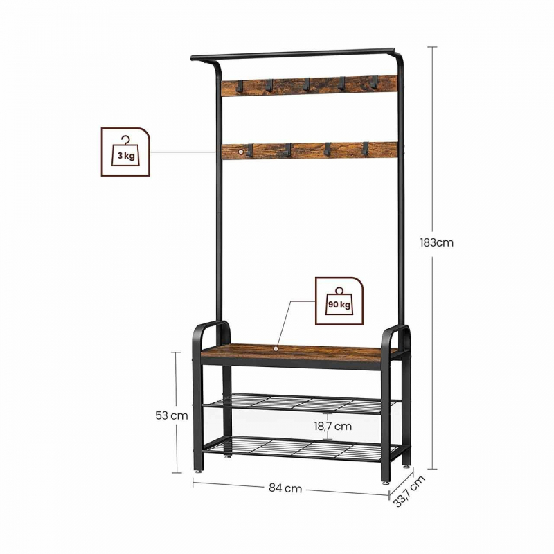 Pevný čierny oceľový rám a stabilné rustikálne hnedé police sú tou správnou kombináciou štýlov, ktorá dodáva pútavému vešiaku individuálny charakter a vysokú nosnosť až 3 kg na jeden háčik a 90 kg na lavicu.