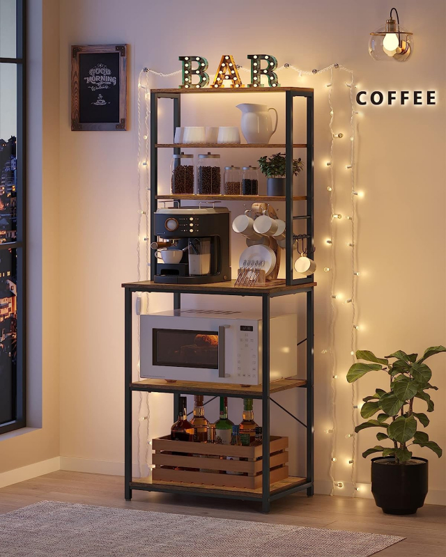 Kuchynský regál sa skladá z čierneho kovového rámovia s háčikmi a z troch užších a troch hlbších drevených políc v rustikálnom hnedom dekore.