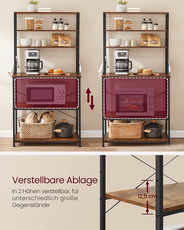 Vďaka kombinácii robustného oceľového rámu a odolnej drevotrieskovej dosky je kuchynský regál veľmi pevný a ľahko odolá vašej mikrovlnnej rúre, kávovaru a ďalšiemu kuchynskému riadu. Stojan je vhodný aj do malých priestorov. So svojimi rozmermi 40 x 80 x 167 cm je ideálny do malých kuchýň alebo ako mini kaviareň. S týmto úložným regálom môžete svoj priestor využiť naplno. Regál je stabilný a bezpečný. Vďaka nastaviteľným nohám je regál na podlahe vždy stabilný a nezanecháva žiadne škrabance. Vďaka priloženej ochrane proti prevráteniu môžete policu pripevniť na stenu, čím sa prostredie stane bezpečným pre vás aj vašu rodinu.