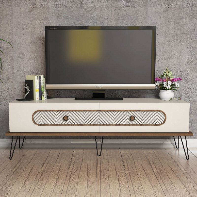 EKOL je viacúčelový televízny stolík v krémovej farbe tvorený nosnou doskou s čiernymi kovovými nohami a dvoma spojenými skrinkami s výklopnými dvierkami, na ktorých je dizajnový ozdobný CNC reliéf v hĺbke 4 mm.