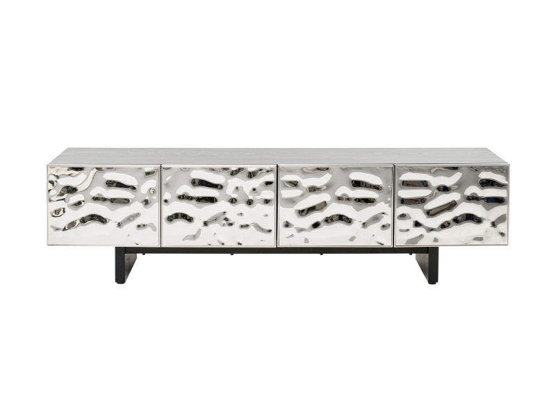 TV skrinka Caldera s exkluzívnym predným dizajnom z lakovanej nehrdzavejúcej ocele je skutočným lákadlom pre každú obývačku. Čierny rám a dyha z jaseňového dreva dodávajú tomuto kúsku moderný vzhľad. Lesklá chrómová predná strana s trojrozmerným dizajnom je vyrobená z kvalitnej nehrdzavejúcej ocele a má povrchovú úpravu transparentným lakom. So štyrmi dvierkami a výškovo nastaviteľnou policou ponúka dostatok úložného priestoru na čokoľvek, čo potrebujete uložiť. Táto skrinka tiež disponuje dverami s funkciou push-to-open, čo zabezpečuje jednoduché a plynulé otváranie a zatváranie. Investujte do kvality, štýlu a praktickosti s našou komodou Caldera. Výška 45 cm Šírka 180 cm Hĺbka 40 cm Hmotnosť 30 kgNosnosť100 kg