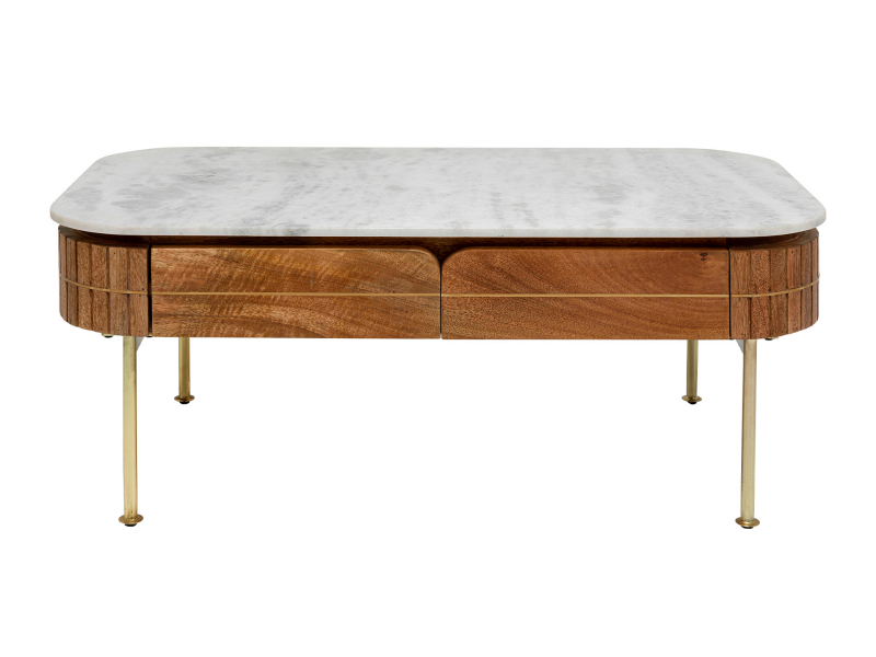 Konferenčný stolík Grace predstavuje spojenie harmónie, luxusu a praktickosti pre váš interiér. S elegantnými krivkami a ušľachtilým materiálovým zložením masívneho dreva a mramoru prinesie do vášho priestoru jedinečnú eleganciu. Korpus a čelá stolíka sú vyrobené z masívneho certifikovaného mangového dreva, čo zaručuje nielen krásny vzhľad, ale aj dlhú životnosť. Kombinuje štruktúrované a hladké časti drevených čiel, čím vytvára originálny dizajn. Stolík je korunovaný decentným oceľovým lemom mosadznej farby, čo dodáva tomuto kúsku nábytku ešte viac šarmu. Štyri priestranné zásuvky pod mramorovou doskou vám pomôžu udržať váš priestor uprataný a dobre organizovaný.Kare DesignNemecká značka Kare Design symbolizuje kreativitu a jedinečnosť. Už od roku 1981 obohacuje trh netradičnými kúskami, ktorým nechýba poriadna dávka štýlu a fantázie. V ich produktovom portfóliu nájdete širokú škálu nábytku, osvetlenia a bytových doplnkov. Značku Kare Design nájdete vo viac ako 200 obchodoch po celom svete. Dajte priestor svojej predstavivosti a naplňte svoj domov originálnym zariadením od Kare, ktoré si okamžite zamilujete. Výška 45 cm Šírka 110 cm Hĺbka 60 cm Hmotnosť 47 kgNosnosť20 kg