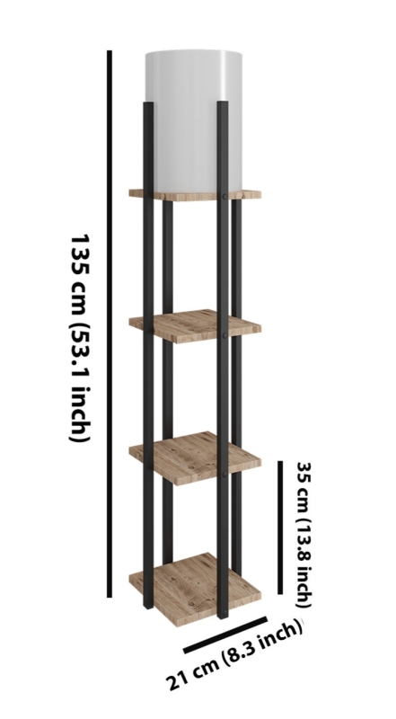Max. 45 - 60 W Telo z drevotrieskových dosiek Profil MDF Látkový klobúk Rozmery poličky: 21 x 21 cm Výška klobúka: 36 cm Celková výška: 135 cm Tlačidlo vypínača na kábli Certifikát CE