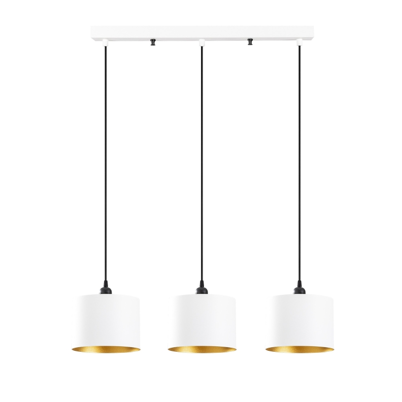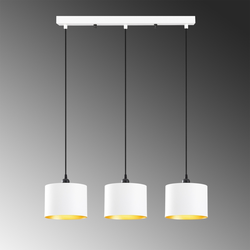 Luster BERCESTE vyzerá ako tri zavesené biele plechovky zvnútra natreté zlatou farbou, ktoré vydávajú zlatisté svetlo.