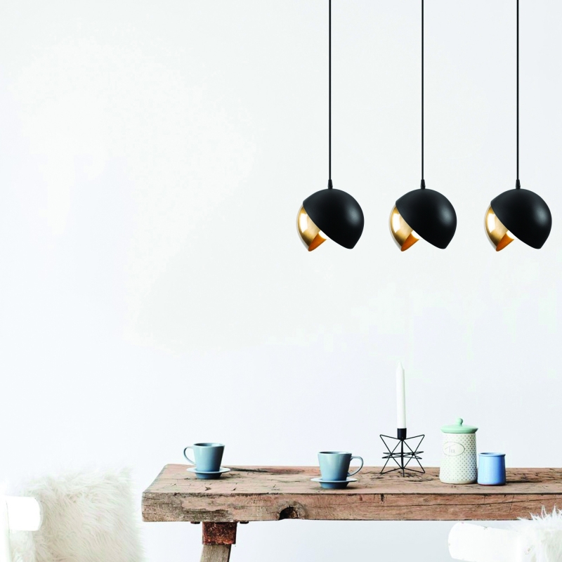 Úzka obdĺžniková základňa lustra BERCESTE nesie na kábloch s variabilným nastavením dĺžky tri čierno-zlaté dizajnové tienidlá.