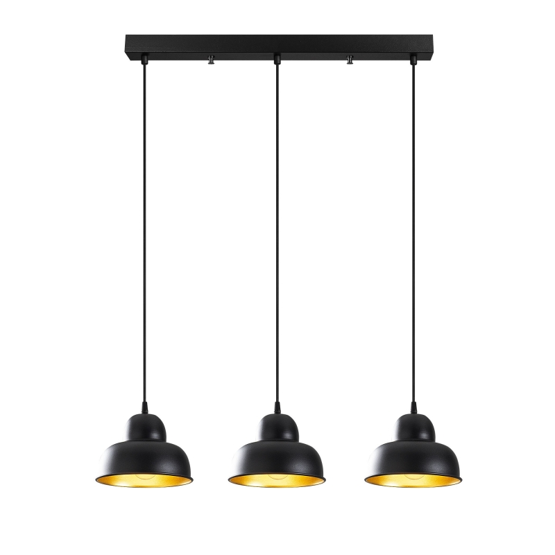 Čierny luster BERCESTE má tri drobné tienidlá v industriálnom štýle, ktorých vnútro je v zlatej farbe, čo prepožičiava svetlu mäkko žlté tóny.