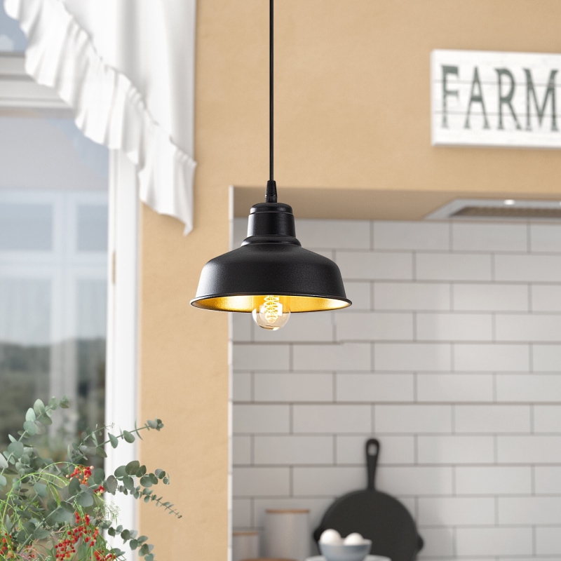Čierny luster BERCESTE má malú základňu, z ktorej visí tienidlo v industriálnom štýle so zlatým vnútrom.